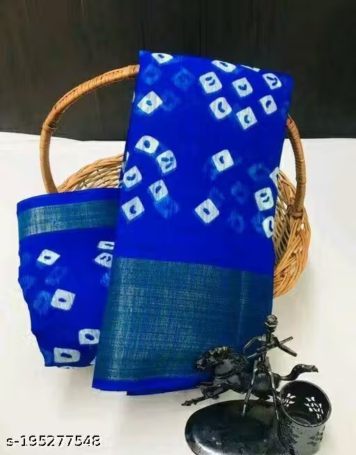 Elegant Blue Bandhani Cotton Linen Saree with Zari Border & Blouse | Lightweight Daily Wear Saree for Women