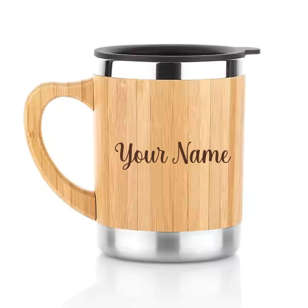 Giftana Personalized Coffee Mug with Lid, Customized Vaccum Bamboo Mug with Handle, Vaccum Insulated Double Wall Tea Cup 350ml for Home, Office, Birthday Gift for Friend, Gifts for Employees