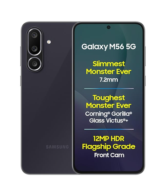 Samsung Galaxy M56 5G Mobile (Black, 8GB RAM, 128GB Storage)| Segment’s Slimmest | Gorilla Glass Victus+| 10 Bit HDR Video| 50MP Camera| AI | Vapour Cooling Chamber| Lag-Free Gaming| Without Charger