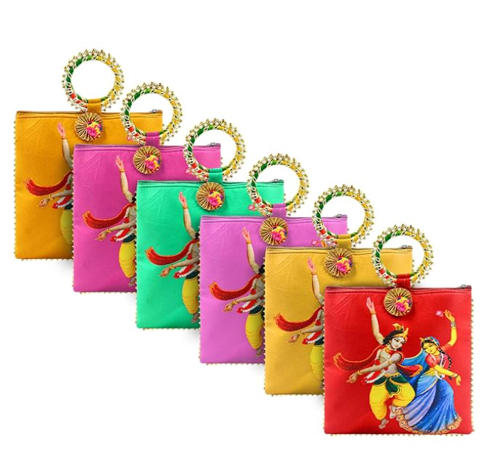 Women Potli Bags Pack of 6 | Gifting Potli with Zip & Bangle Handle | Traditional Shagun Return Gifts Potli for Mehandi, Haldi, Baby Shower, Wedding, Sangeet (Radha Krishna)